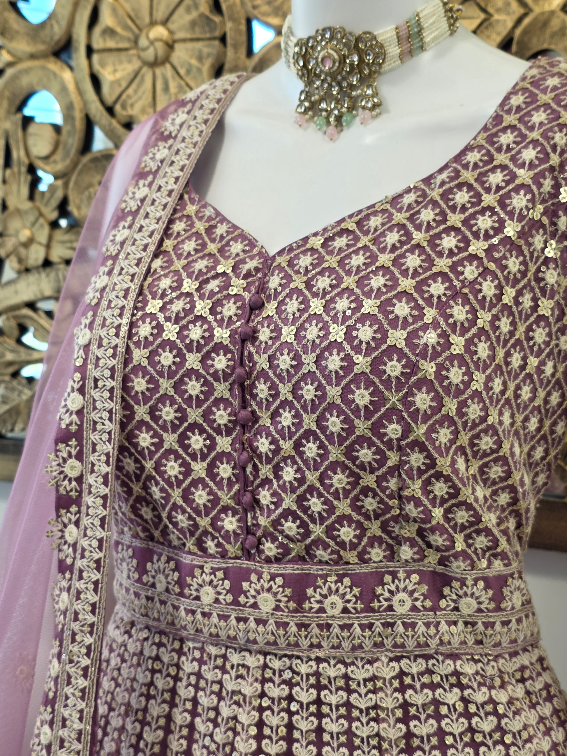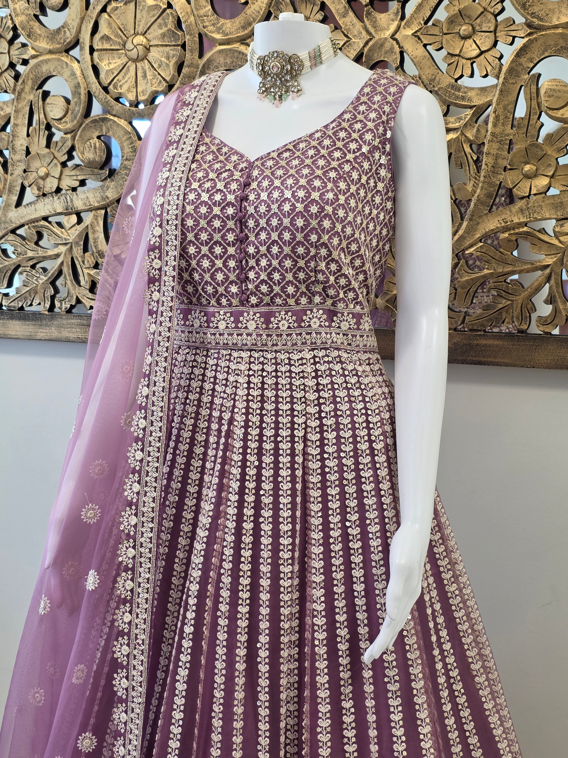 Aarvi embodies delicate grandeur in a dreamy shade of mauve. Crafted from a luxe net and silk-blend base, this Anarkali blooms with intricate thread and sequin embroidery that cascades gracefully from the bodice to the hem. The Sweetheart-neckline is adorned with refined handwork, while the flare showcases ornate traditional motifs that elevate its royal charm. Paired with a soft, embroidered dupatta featuring dainty floral accents and a scalloped edge, Aarvi is perfect for receptions, sangeets, and elegant festive evenings.