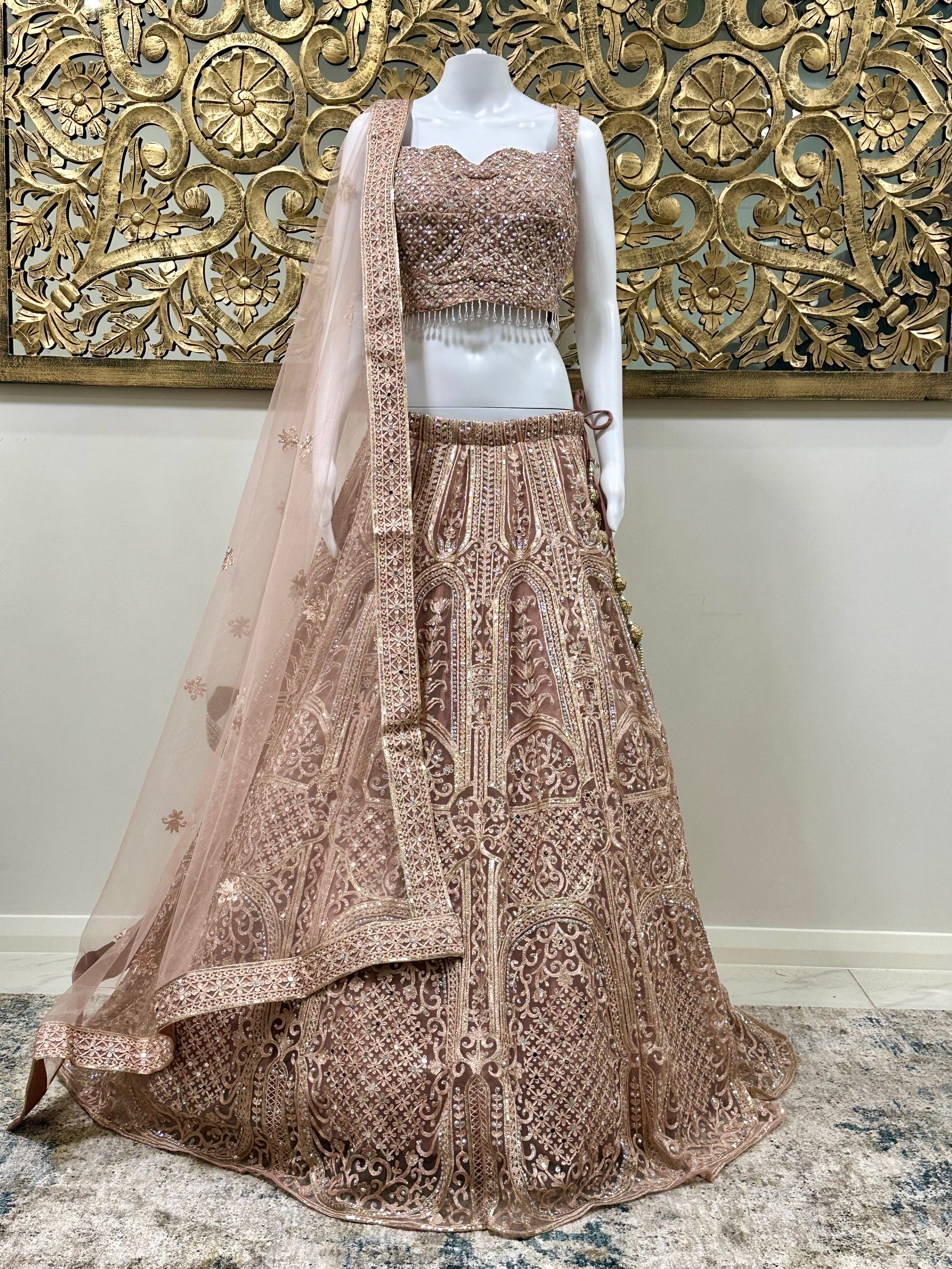 Anaya is a dazzling three-piece ensemble in a rich shade of dusty pink. The skirt features a full, voluminous cut with heavy net-on-net layering and intricate gold and tonal Zari, thread, and sequin embroidery in detailed patterns. A coordinating sheer net dupatta, finished with a matching heavy embroidered border, completes this glamorous look, making it suitable for wedding receptions and grand evening functions.