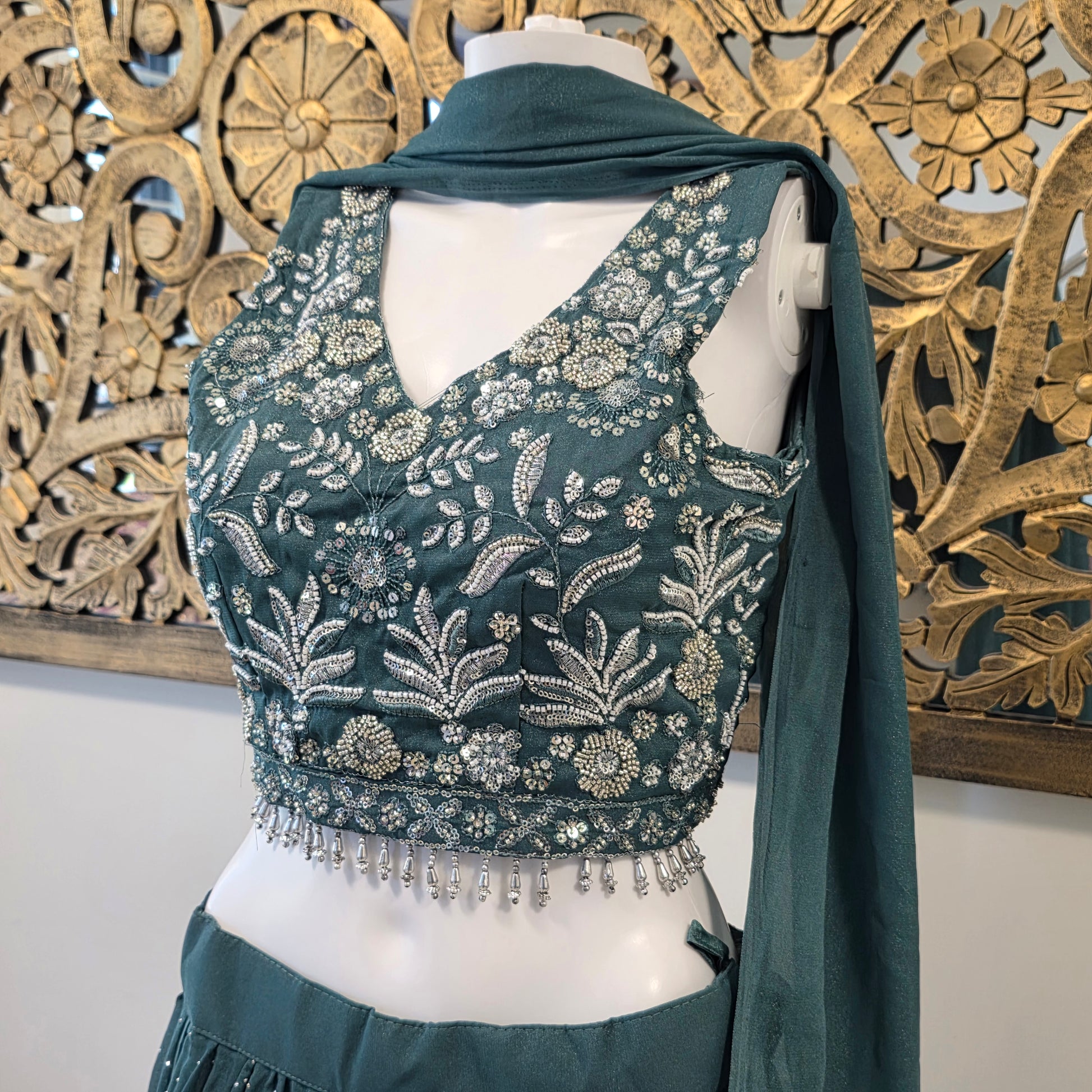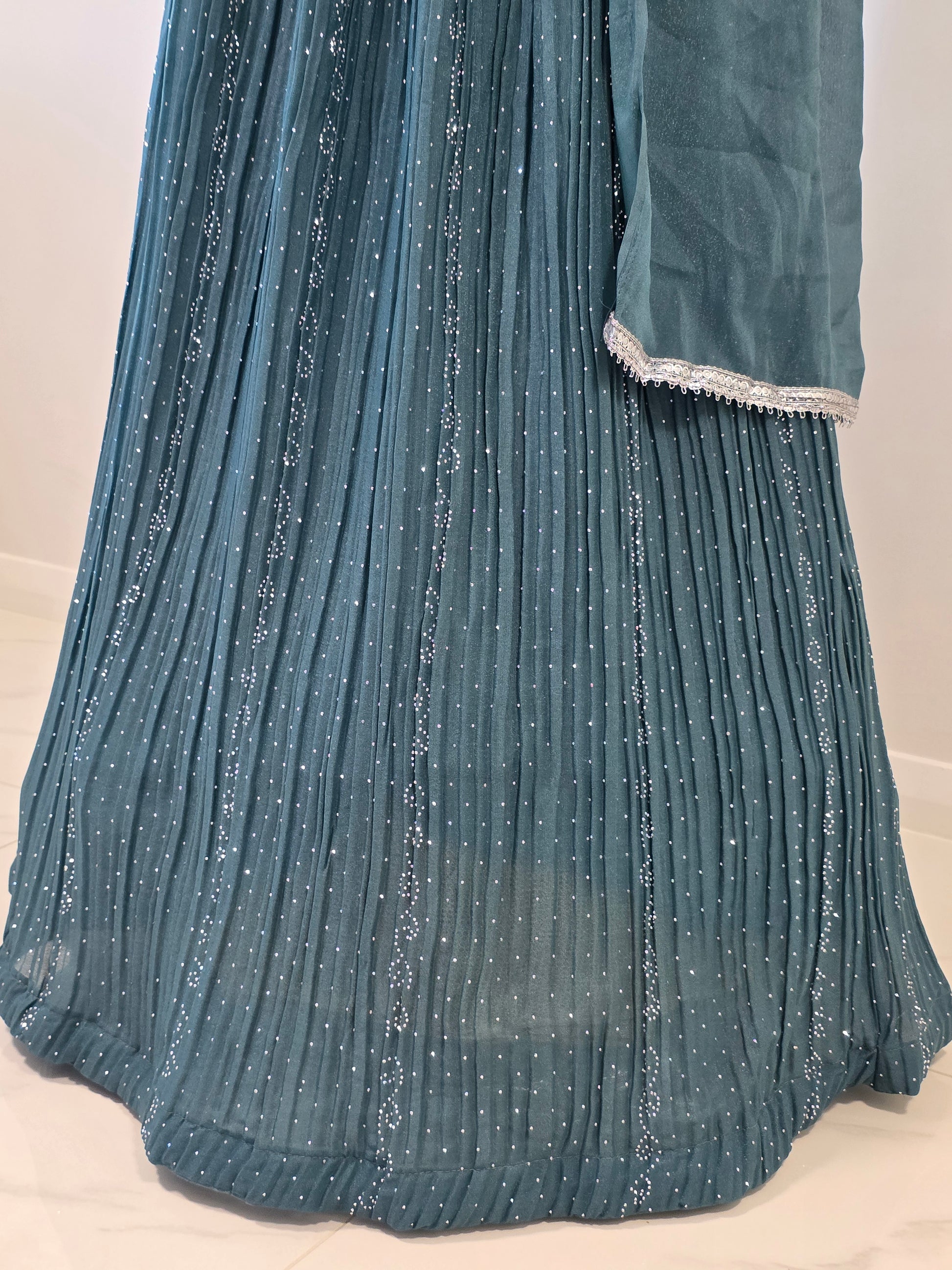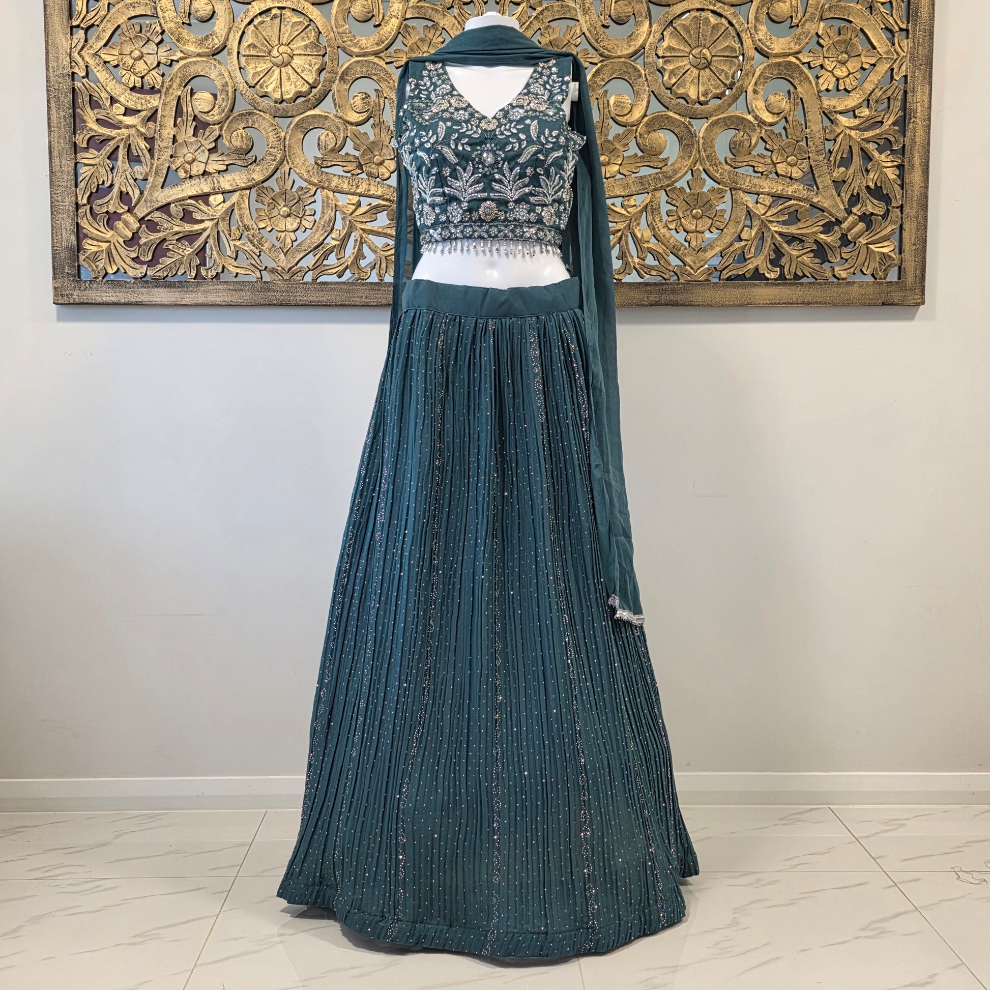 The Arohi Turquoise Lehenga Set features a textured crushed viscose skirt with fine metallic shimmer detailing, paired with a sleeveless V-neck blouse finished with hand-embroidered Zardozi and silver beadwork. Crystal lace hangings add a soft sparkle, while the matching viscose dupatta with lace borders completes the look. Arohi is perfect for celebrations — from birthdays to sangeets — and even better when you’re dancing to “Nachde Ne Saare.”