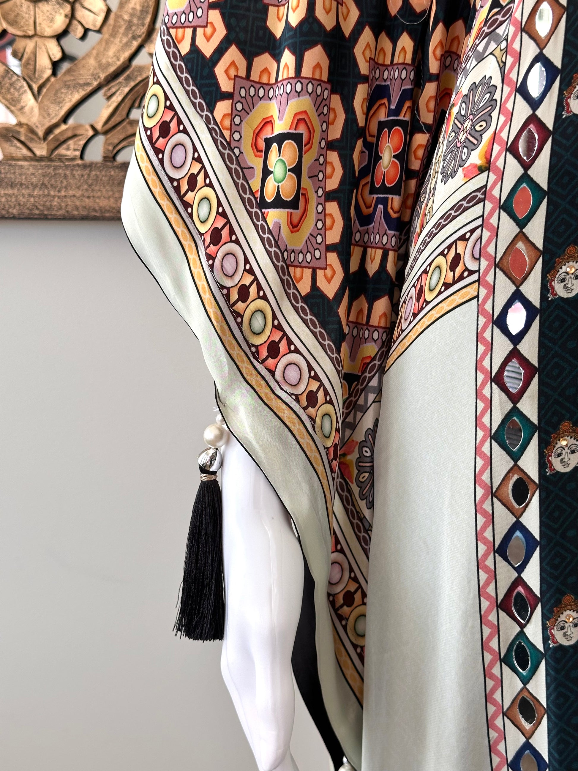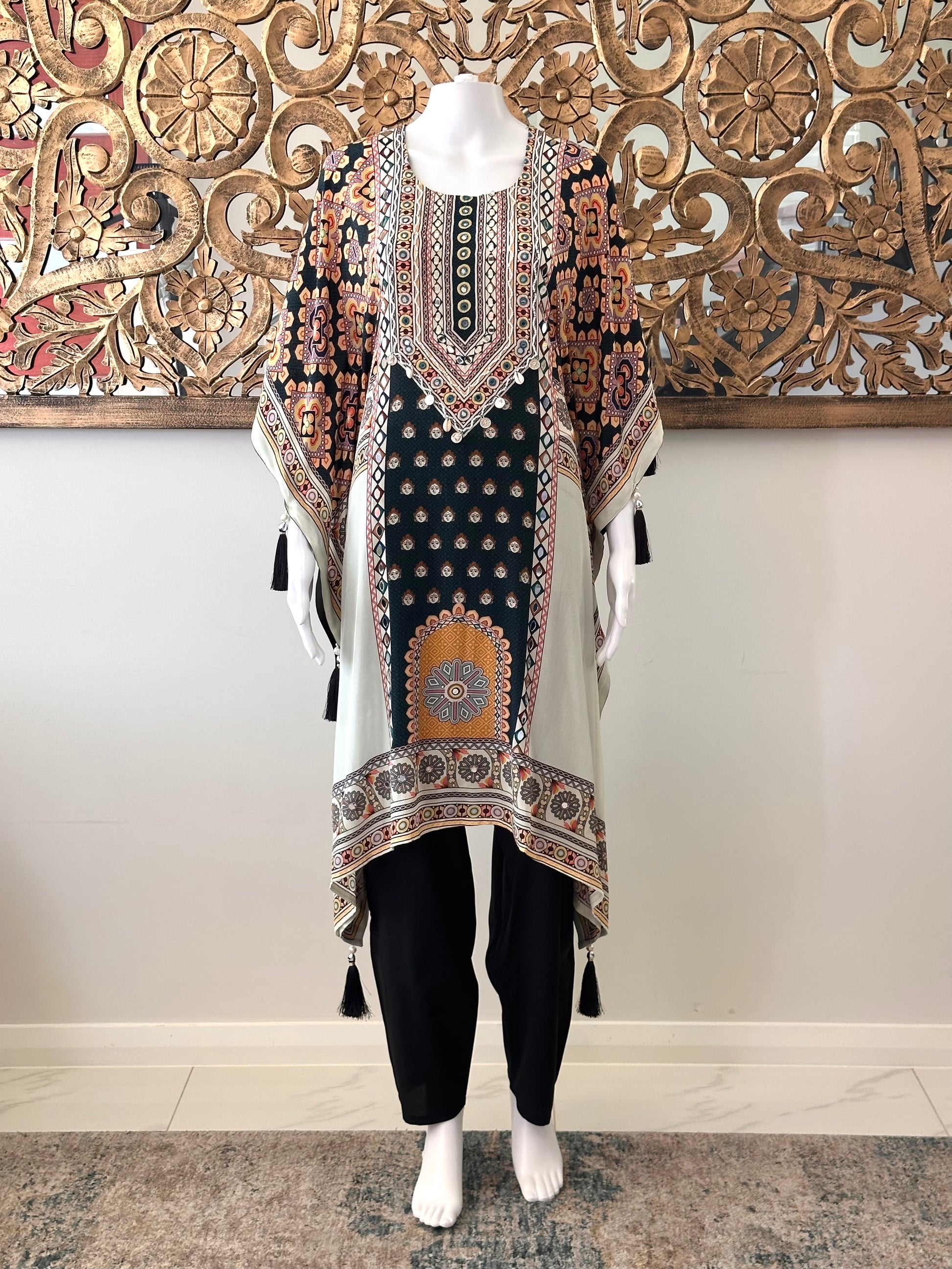 Avarna is an Indo-Western co-ord set crafted in soft, flowy fabric with a statement digital print for a striking silhouette. The kaftan-style kurta features intricate front detailing, bold patterns, and tassel accents that add movement and charm. Paired with sleek black pants for a balanced and modern finish, this set offers an effortlessly elegant look perfect for festive and contemporary occasions.