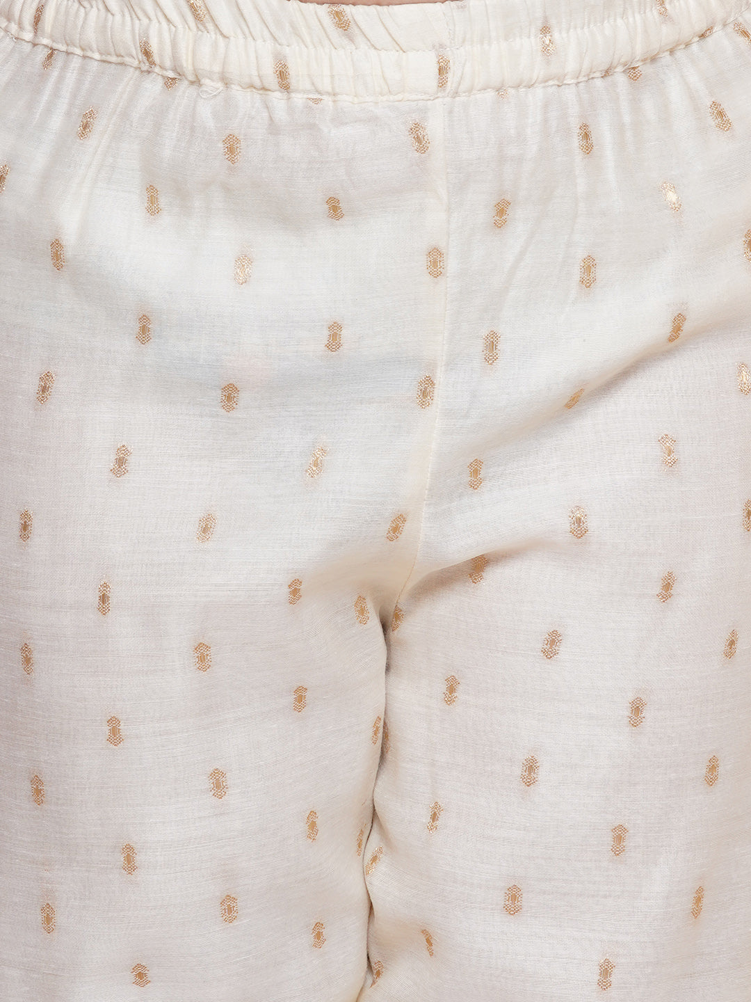 Heer is a graceful off-white Gharara set that blends traditional charm with a playful festive touch. The silk-blend Angrakha-style kurta features delicate booti embroidery, a flattering V-neck, and a flared calf-length hem. Paired with a comfortable elasticated Gharara and a bright pink dupatta with gold detailing, this set shines beautifully at any celebration.