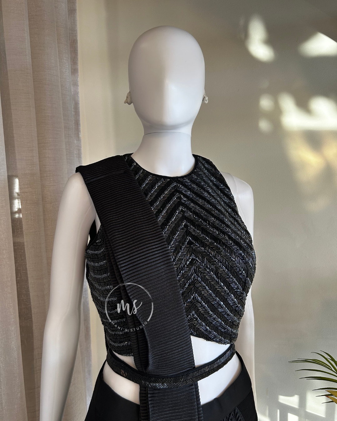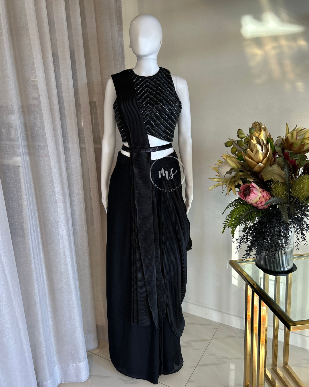 Kiara redefines modern glamour with its striking all-black statement. The sleeveless blouse features dramatic textured detailing and a chic cutout design that adds a bold edge. Draped in a flowy black saree with a sleek silhouette, this ensemble is made for red carpet moments, cocktail nights, or fashion-forward festivities. Minimal yet fierce, Kiara speaks volumes without saying a word.
