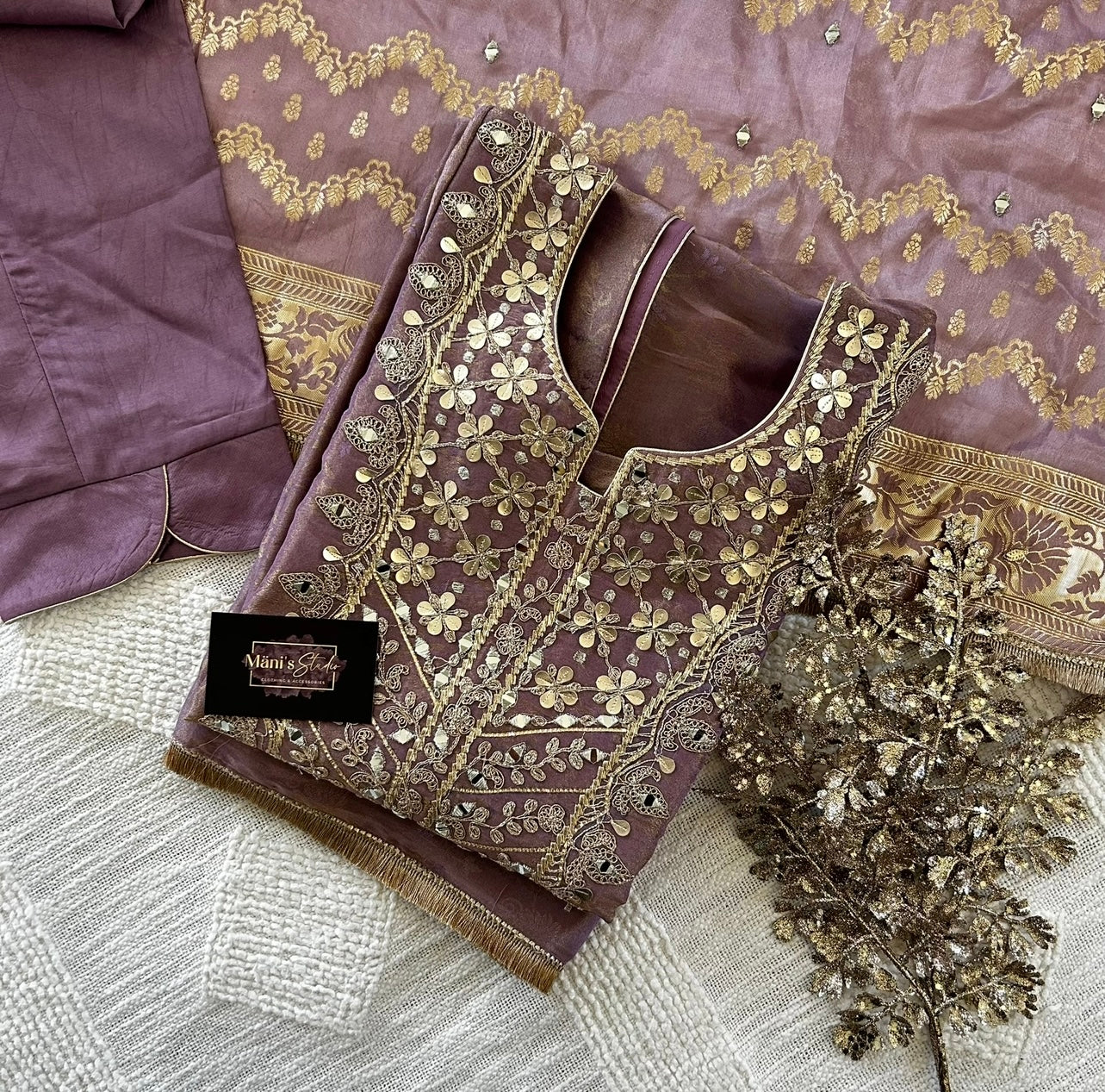 Lavya is a celebration of grace and shimmer in a lilac Jacquard Silk base. Adorned with intricate Dori and leather Gota work, the kameez sparkles subtly with sequins and finishes in a delicate Gota fringe hem. Piping details on the neckline and sleeves add structure, while the ensemble is completed with matching Shantoon pants and a rich Banarasi dupatta edged in Gota fringe — a perfect blend of elegance and festive flair.