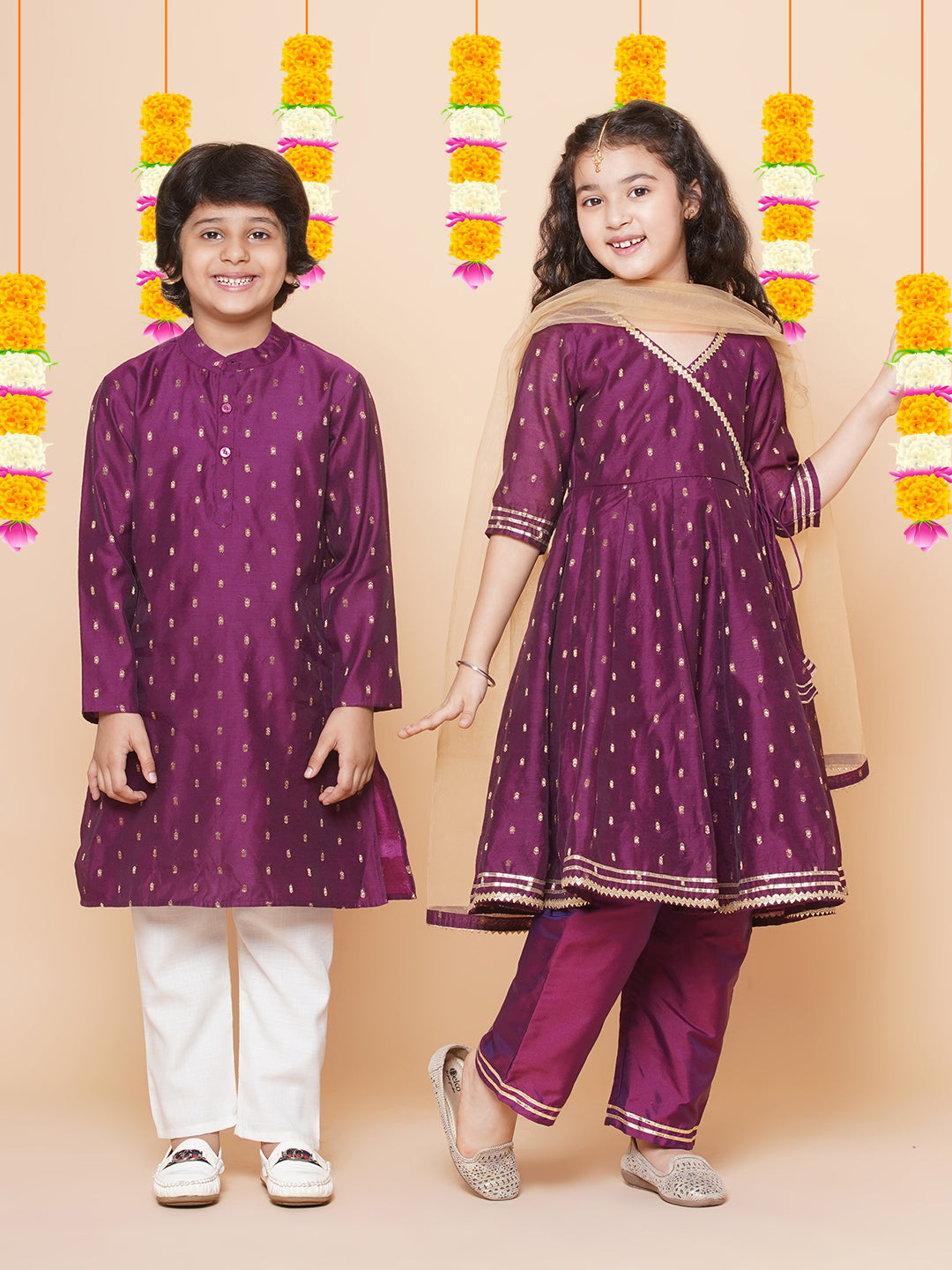 Mahir is charm crafted for celebration – a rich burgundy kurta set designed with both tradition and ease in mind. Made in a silk blend fabric with subtle woven detailing, the straight-cut kurta features a classic band collar and full sleeves for a timeless silhouette. It’s paired with comfortable ivory trousers and open side slits for effortless movement, making it perfect for festive gatherings, weddings, or family photos.