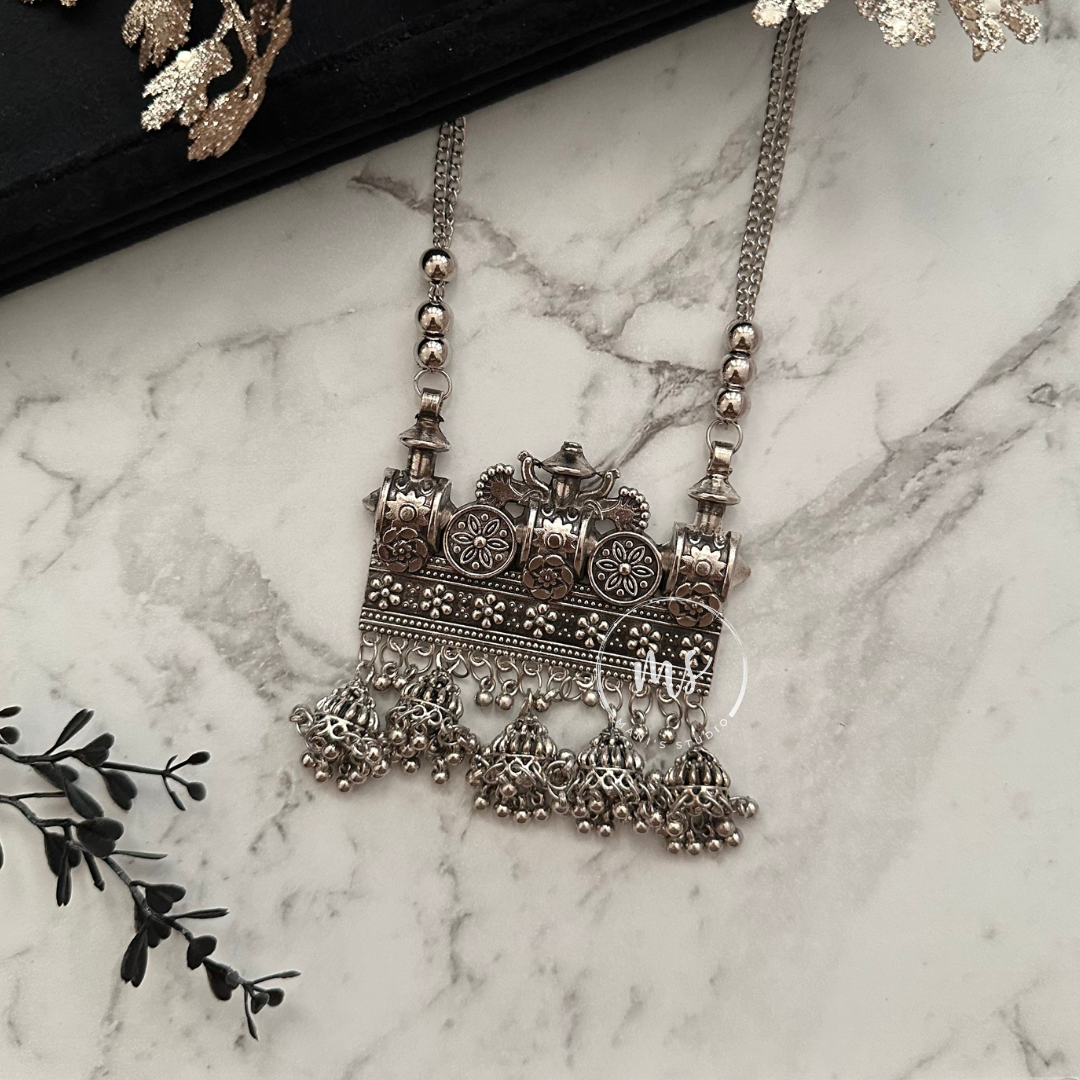 Mahiya features a structured oxidised pendant with intricate carvings and layered detailing. A standout piece that adds edge to festive or everyday looks.