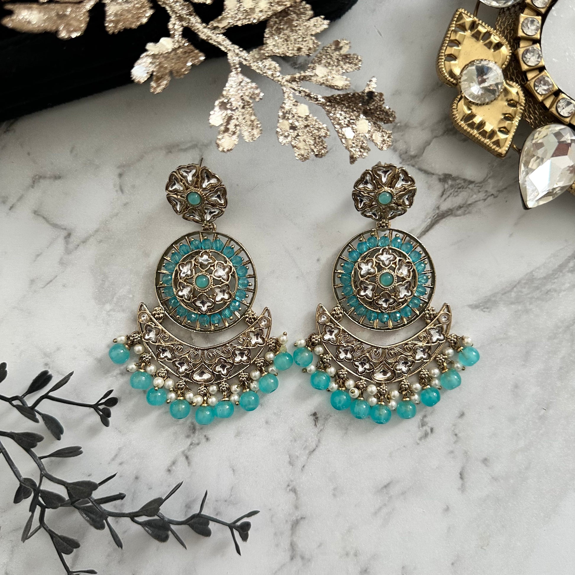 Nayra blends classic charm with colourful detail. Featuring a detailed circular motif, mirror accents, and delicate bead drops, this set adds just the right pop to any festive outfit. Available in turquoise blue, baby pink, and deep red.