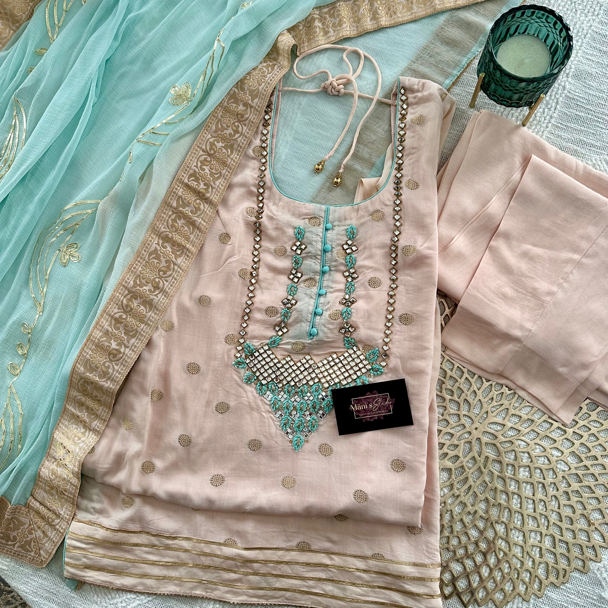 Nysra blends grace and subtle sparkle in a soft blush pink tone. The kurta is elevated with delicately arranged thread embroidery and glistening sequin detailing along the neckline. The soothing pastel base is paired with a fresh aqua dupatta featuring fine embroidered borders, and soft satin-finish bottoms that add just the right amount of shine. A graceful choice for semi-formal events and elegant occasions.
