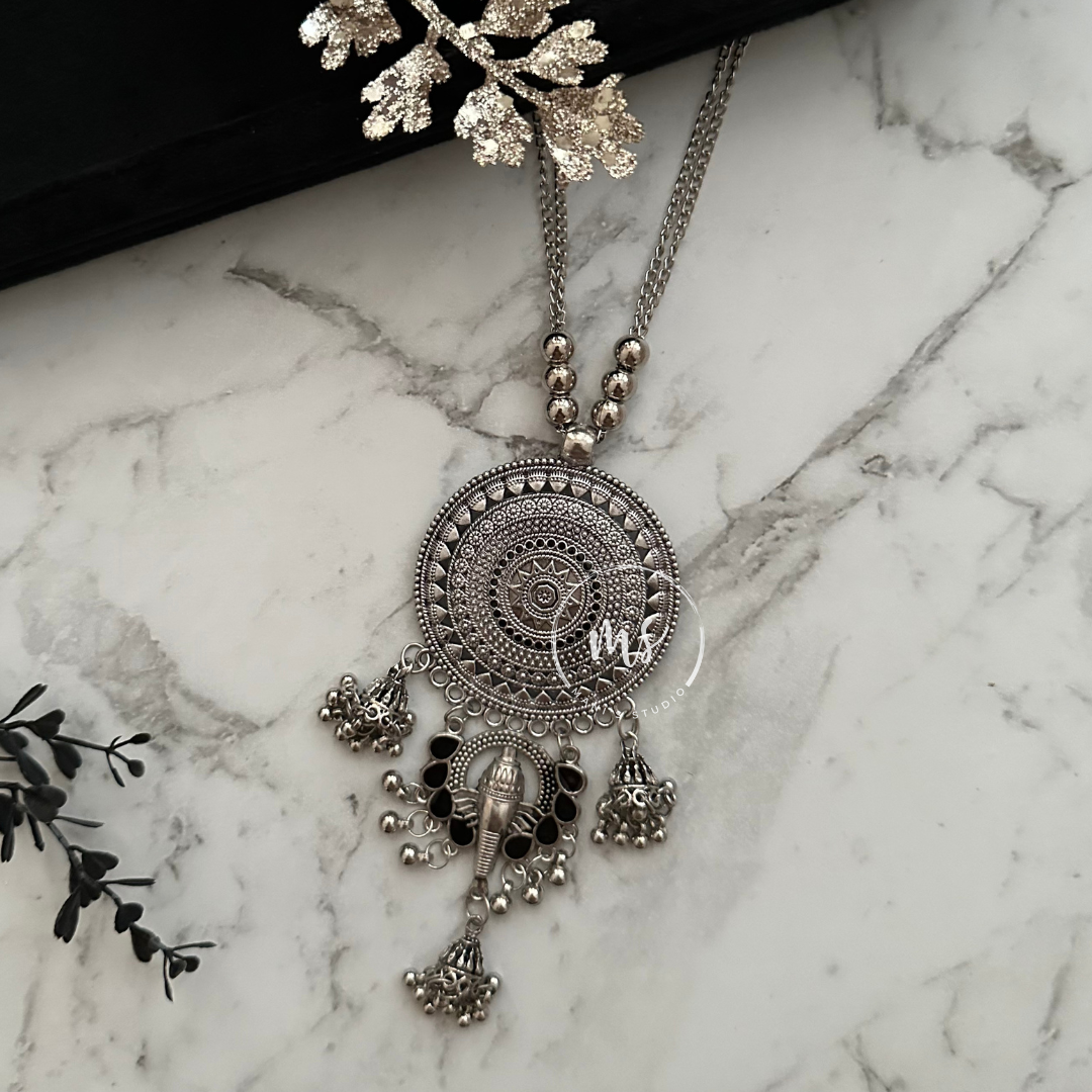Rayna is a bold oxidised necklace that brings a touch of tradition with a modern edge. The circular pendant and cascading danglers add movement and charm — perfect for layering with ethnic or fusion looks.