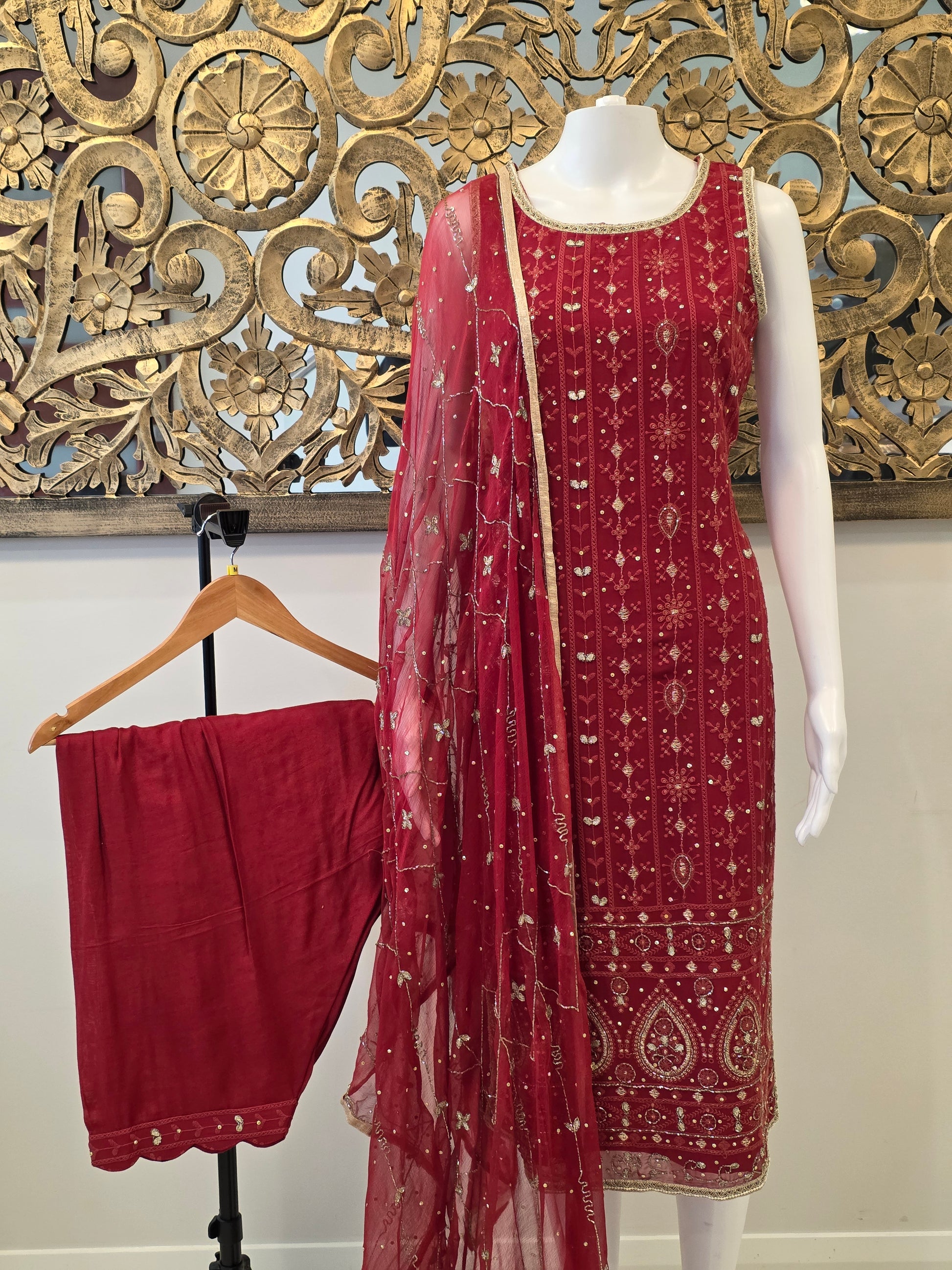 Rohi makes a bold statement in a deep ruby hue, exuding confidence and grace. The sleeveless kurta is adorned with vertical rows of delicate sequin and thread embroidery, creating a sleek, elongating effect. The set comes with a net dupatta featuring matching embroidery and a shimmery border, adding balance and flow to the structured silhouette. Perfect for festive evenings or formal celebrations.