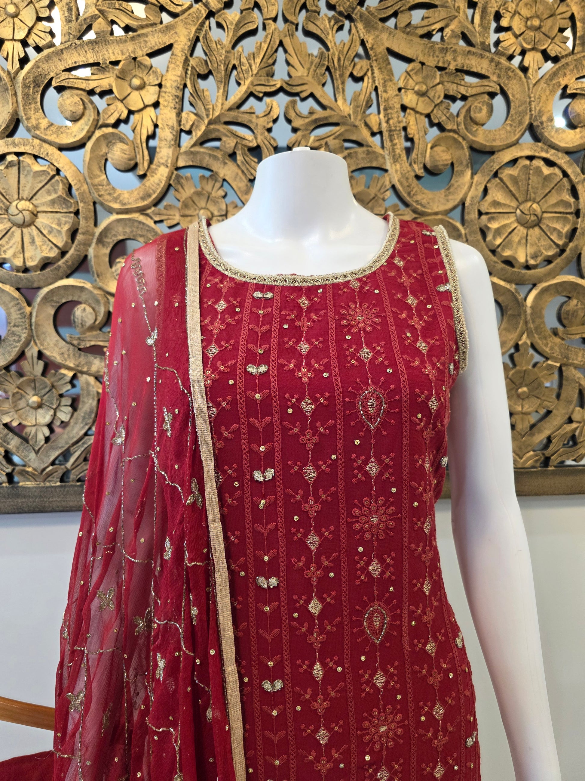 – Sleeveless ruby kurta with vertical sequin and thread detailing
