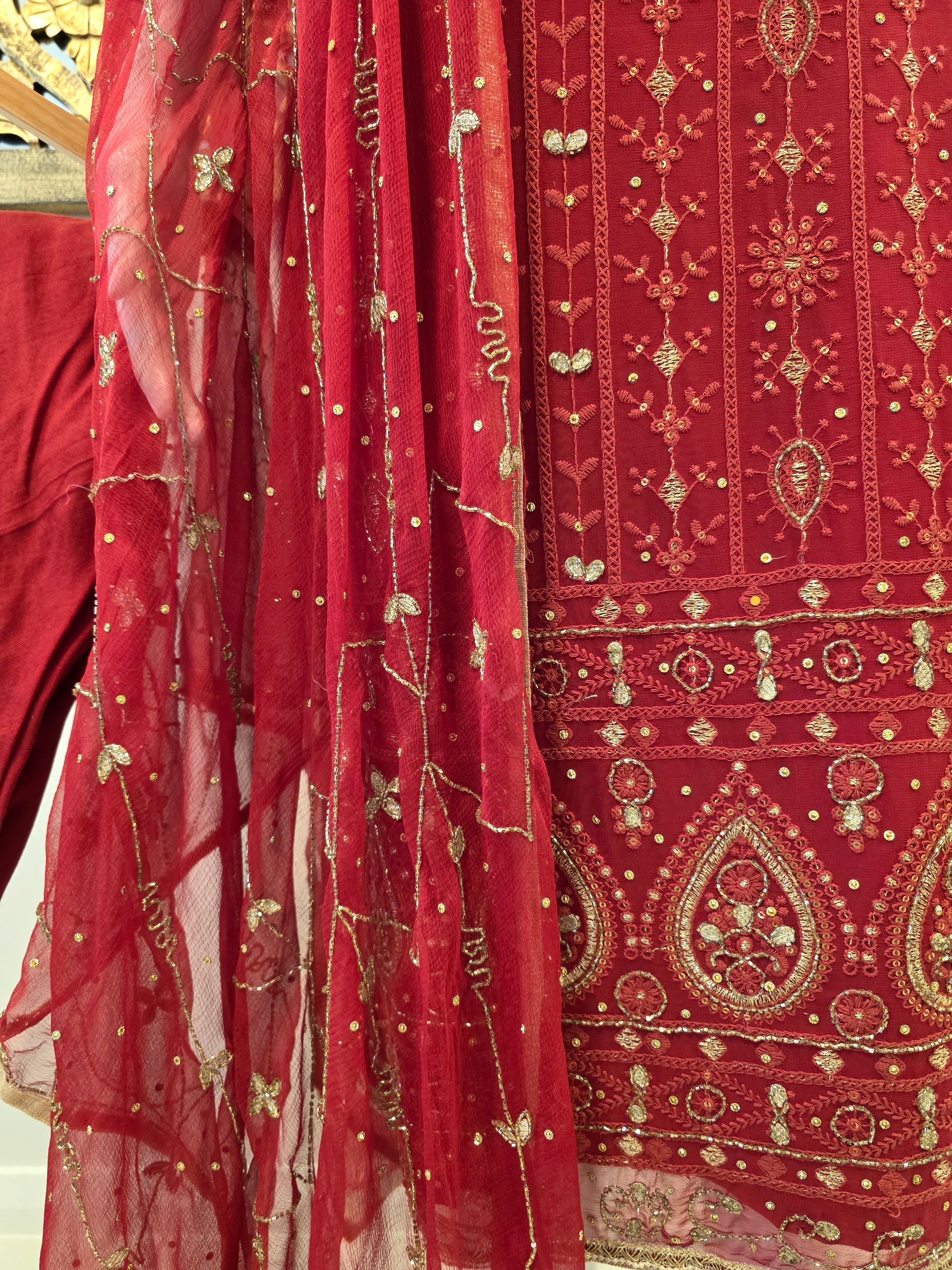 – Net dupatta with coordinated embroidery and shimmer border