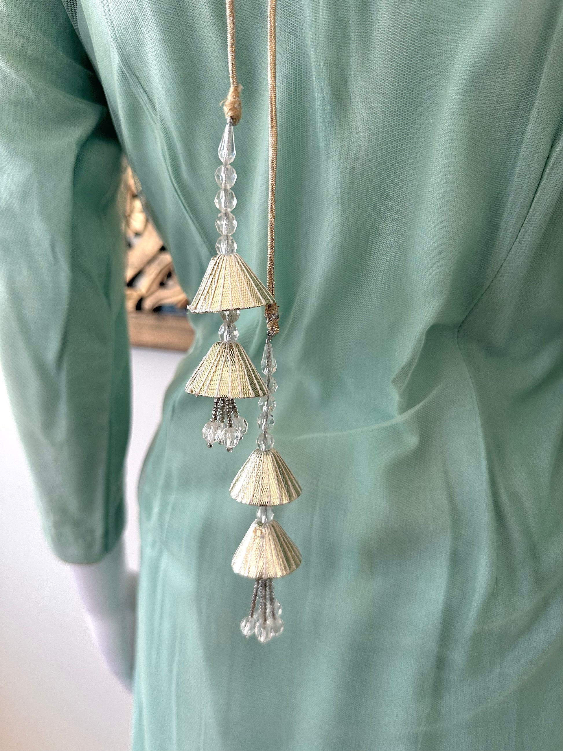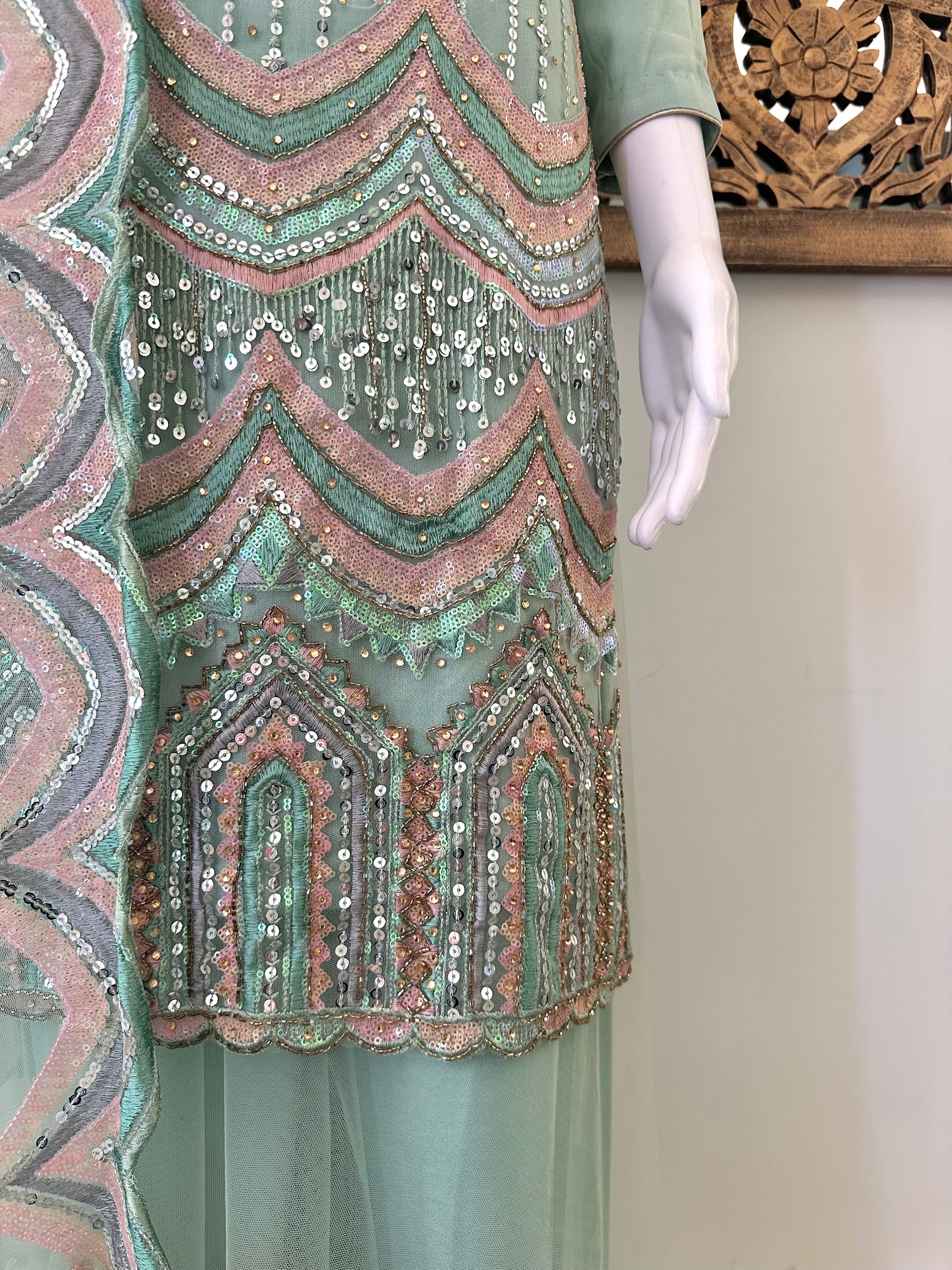 Ruhvee is crafted in a refreshing mint-green hue on soft net fabric, brought to life with intricate multicolour threadwork and delicate sequin detailing. This three-piece sharara set features a straight-cut kurti richly embellished from neckline to hem, paired with a flowy sharara that balances movement and elegance. The look is completed with a heavily embroidered dupatta, finished with scalloped edges that frame the outfit beautifully. Perfect for festive occasions, weddings, themed celebrations, or mehendi nights, Ruhvee radiates effortless grace in every detail.
