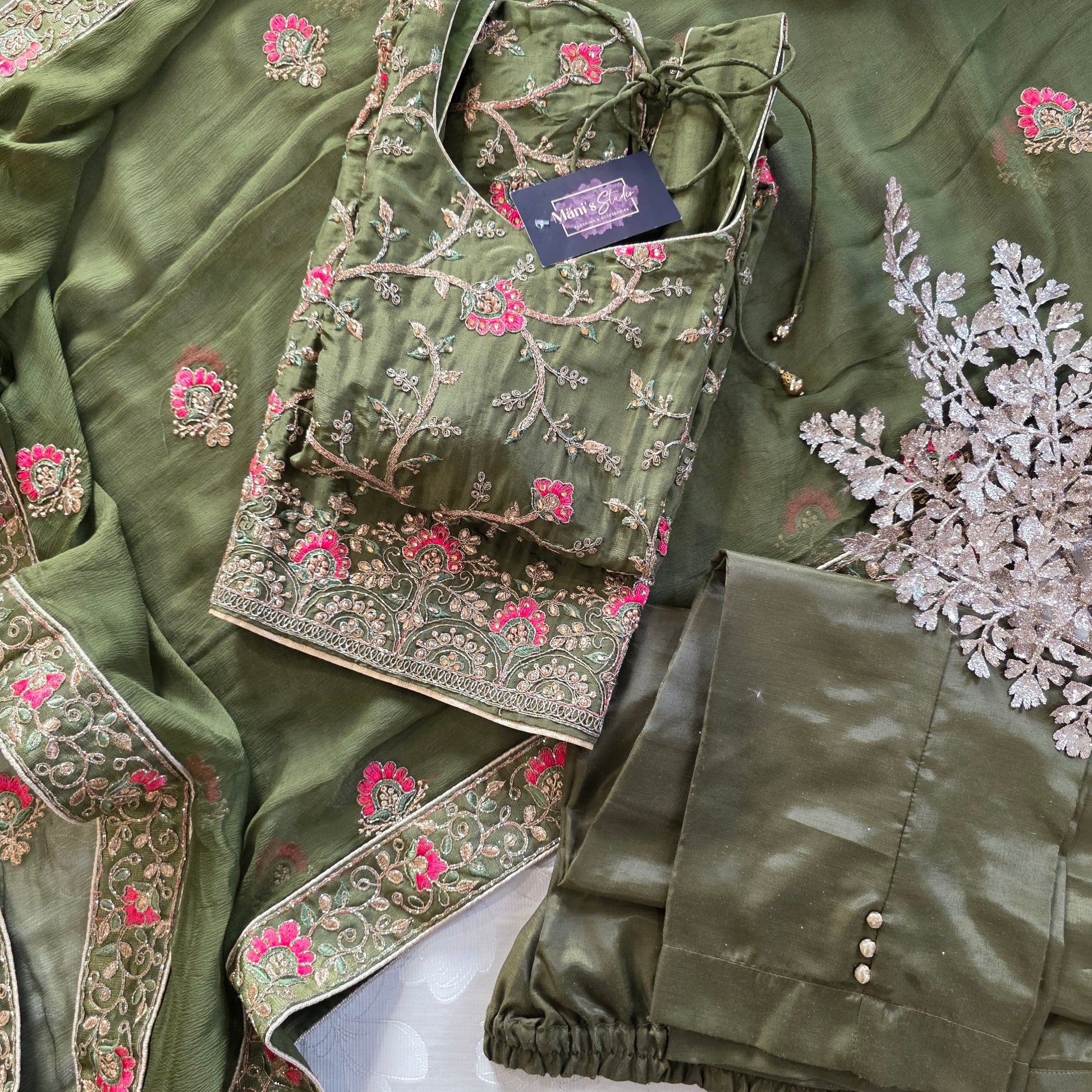 – Olive green silk-blend suit with floral thread and zari embroidery