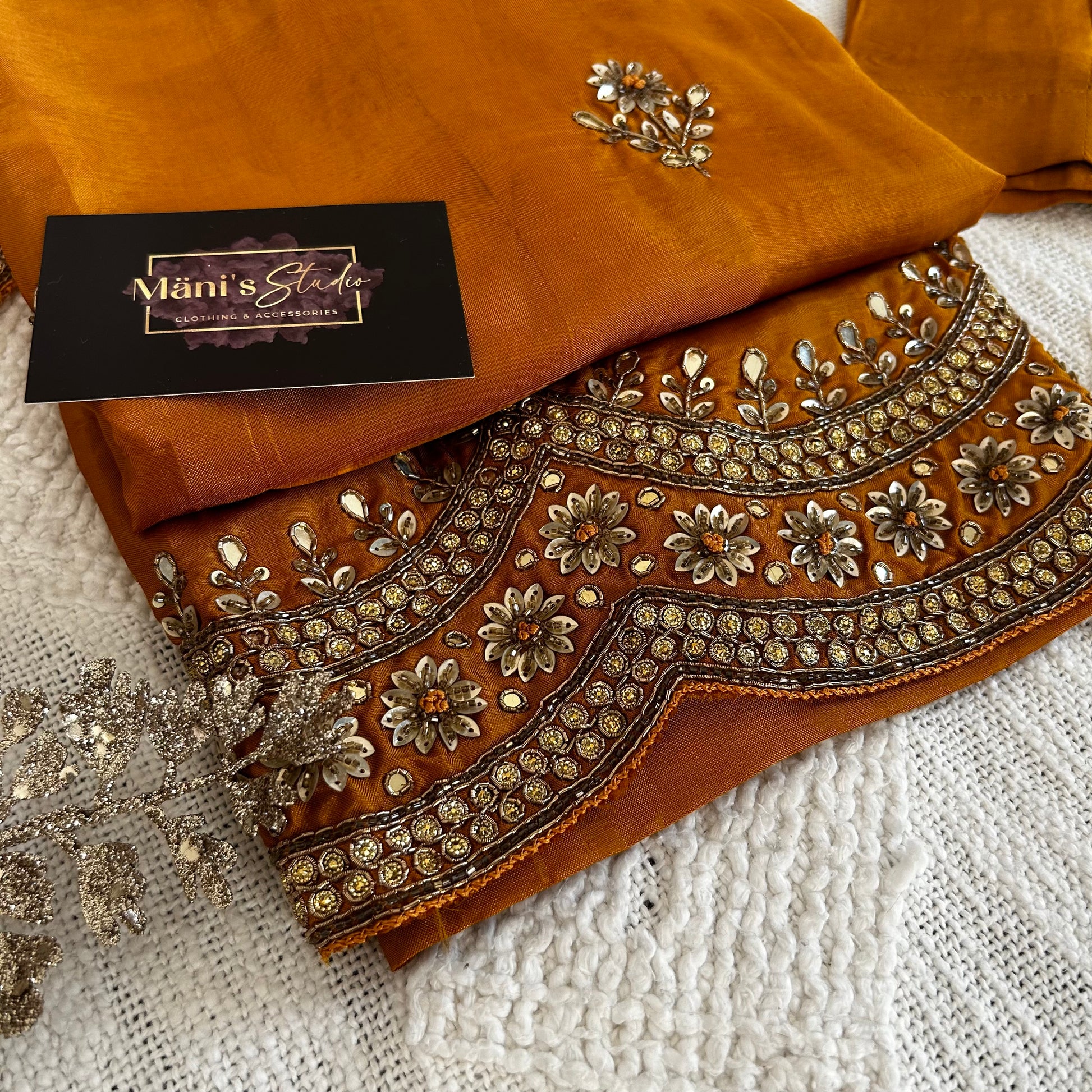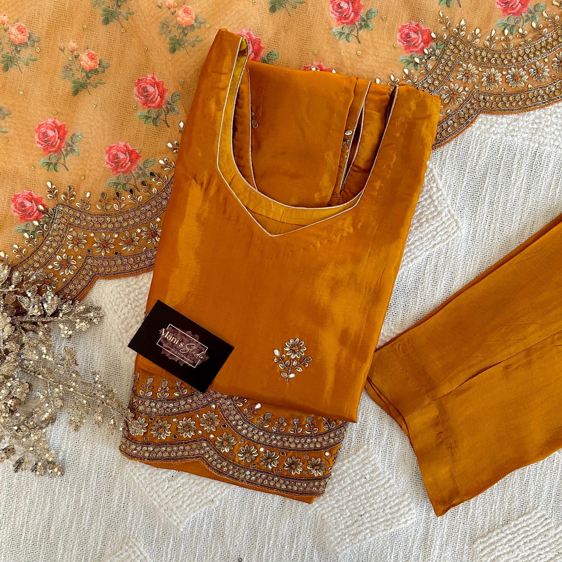 – Mustard silk-blend suit with Zari and mirror-style embroidery