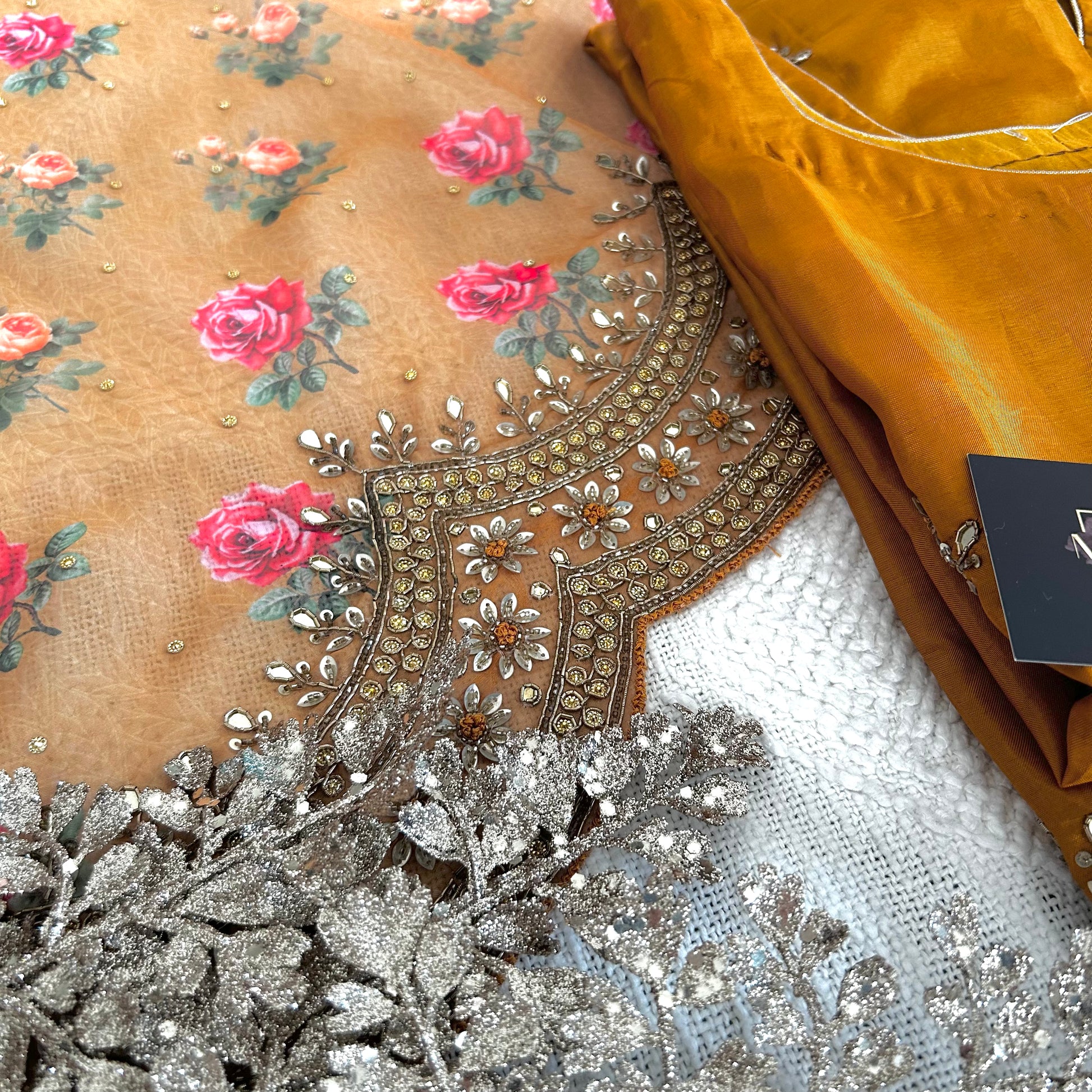 Safya is a golden treasure, radiating festive warmth in a rich mustard hue. Crafted in a silk-blend fabric, this suit is adorned with fine Zari and mirror-style embroidery along the neckline and hemline. The suit’s elegance is amplified by the matching trousers with subtle detailing, while the contrasting dupatta features floral motifs and shimmer accents, adding depth and charm to the look. Perfect for festive dinners and wedding events.