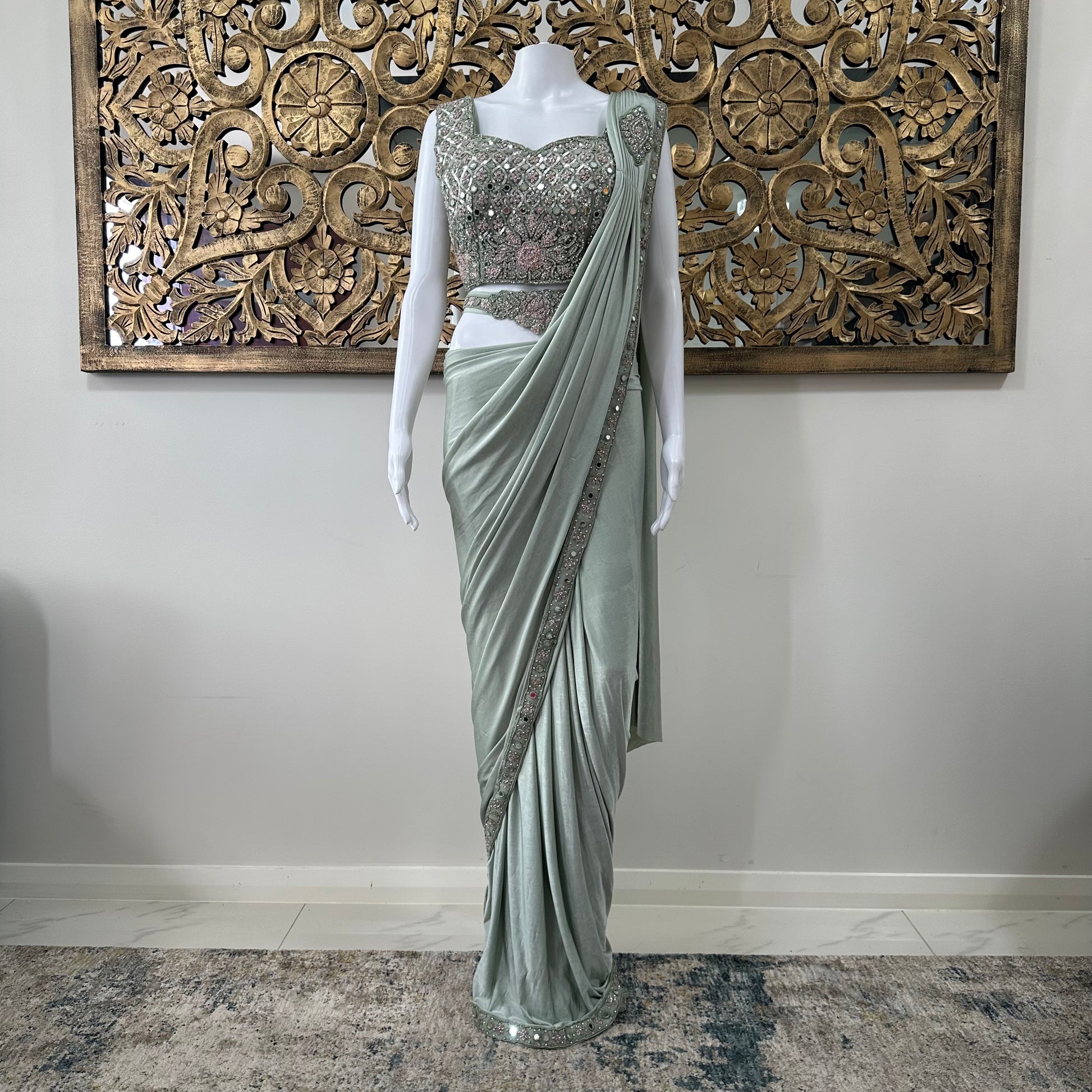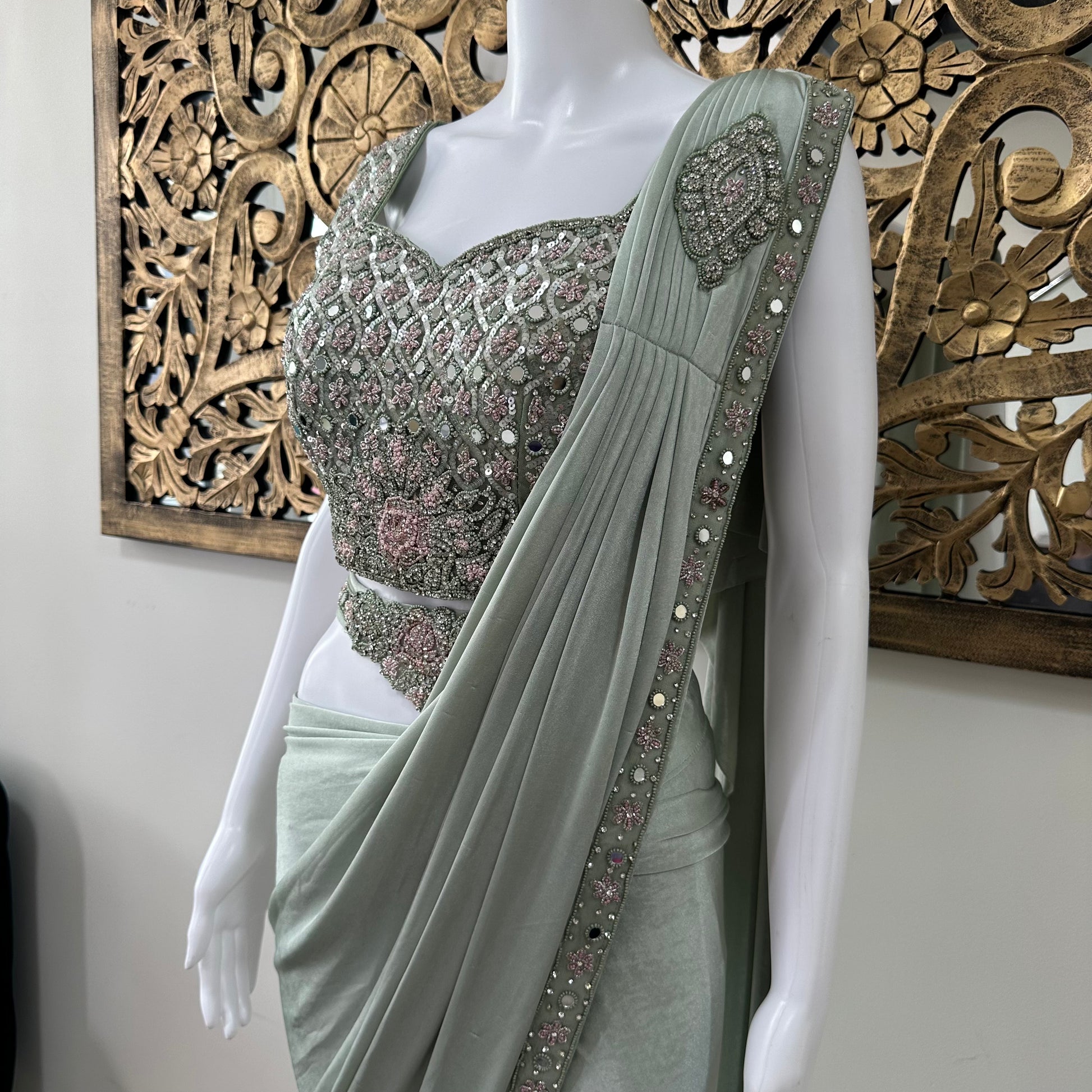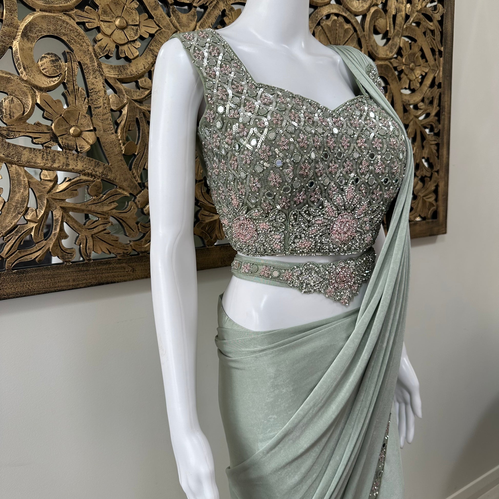 Sanya brings a dreamy elegance to life in a soothing sage green. The heavily embellished blouse sparkles with muted tones of silver, blush, and sage, adorned with beads, sequins, and mirrorwork. The pleated drape falls gracefully, echoing the refined opulence of the blouse. Whether it’s a wedding reception or a formal celebration, Sanya is an ode to timeless glamour.