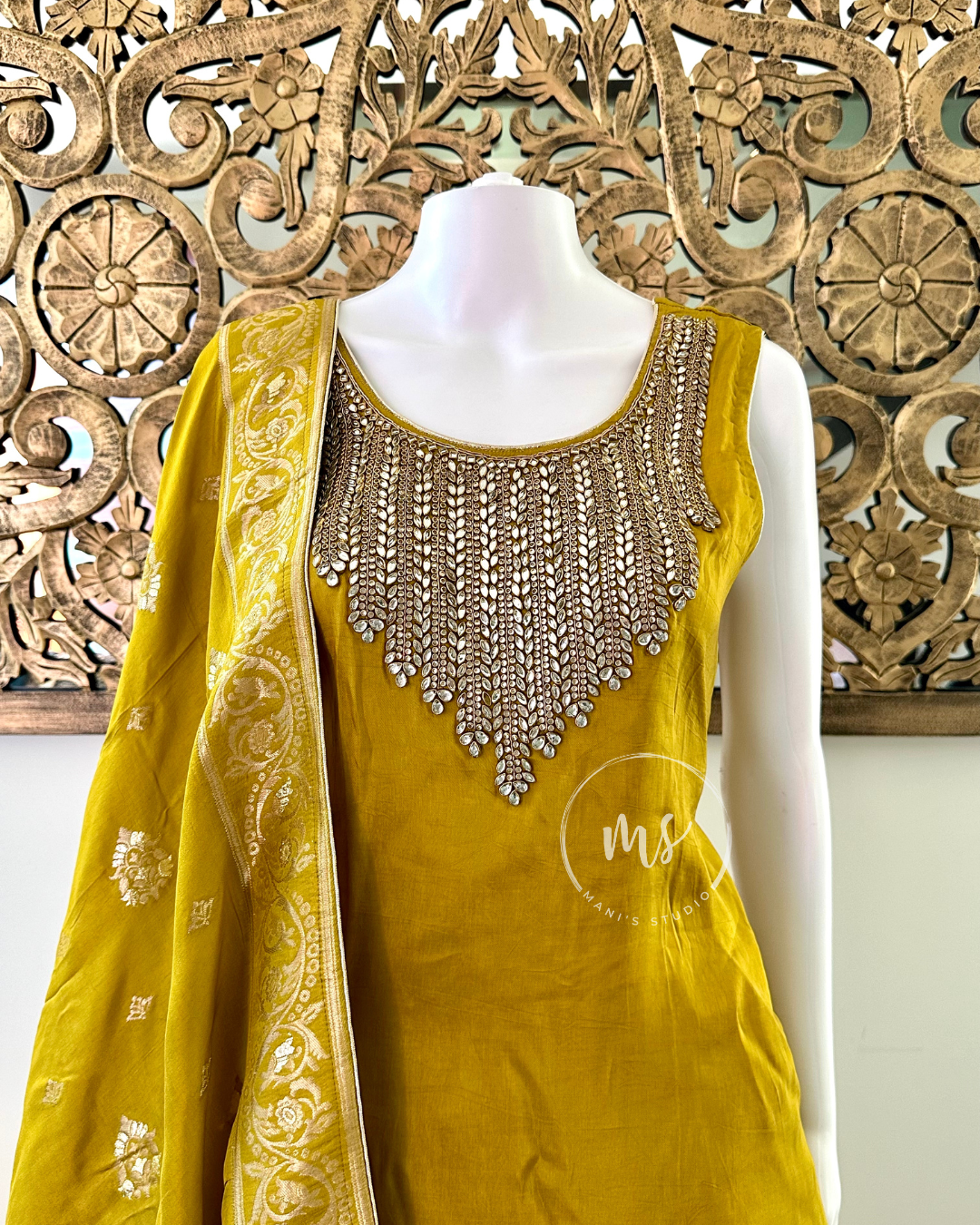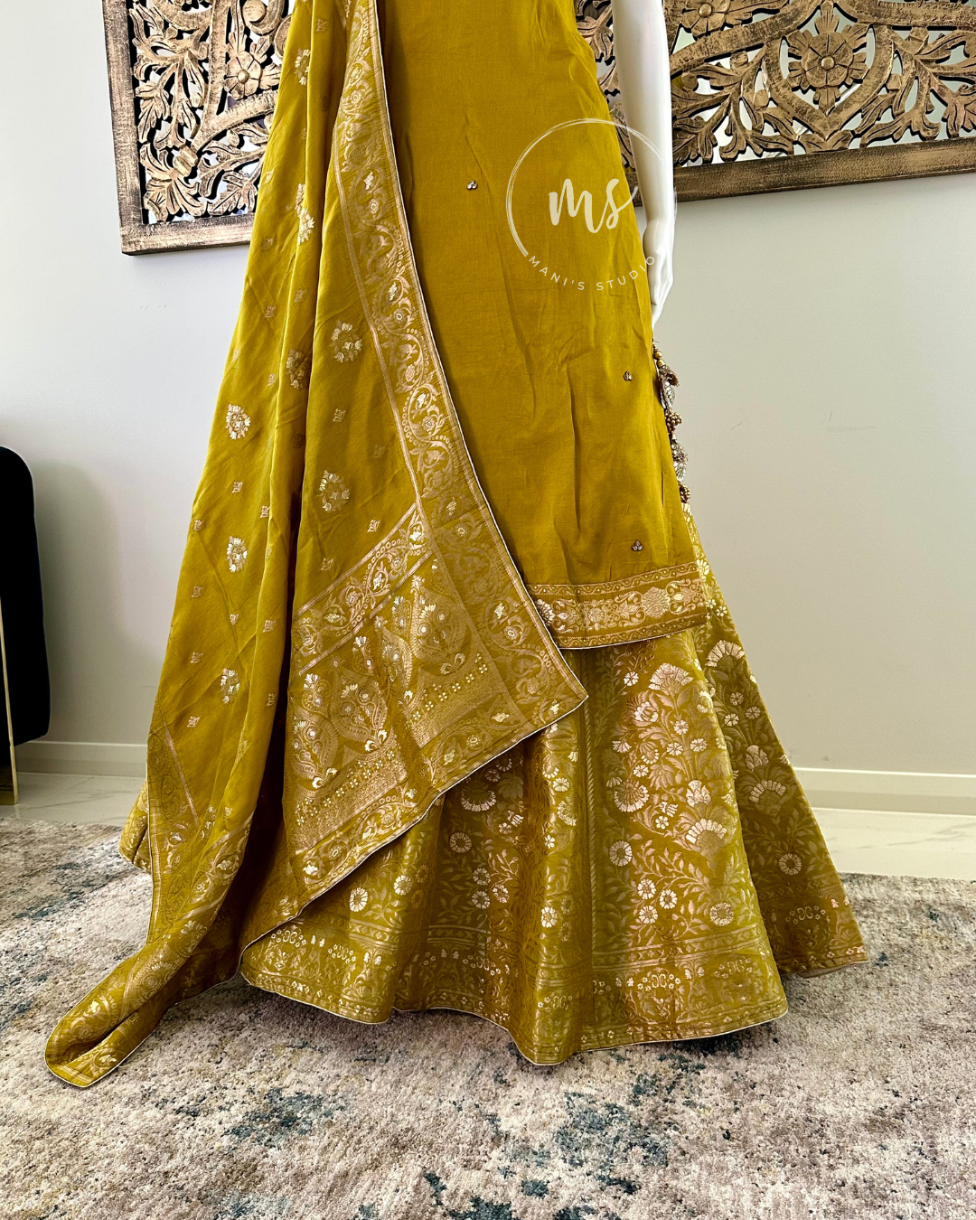Sarika is a celebration of regal tradition in a bold mustard hue. This lehenga set features intricate Kundan embellishment on the neckline, adding a statement shimmer to the rich Banarasi fabric. The flared lehenga showcases woven gold detailing, while the matching dupatta is finished with Banarasi borders and scattered motifs for a cohesive, luxurious finish. A perfect pick for weddings, sangeets, or festive occasions where heritage meets high style.