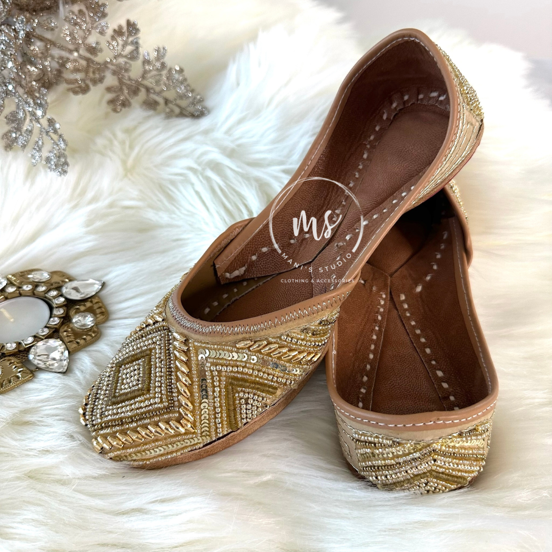 Bold and beautiful, Sitara is adorned with geometric zari and sequin work that shines with every step. A perfect blend of tradition and trend, this pair is ideal for evening events and festive fits.
