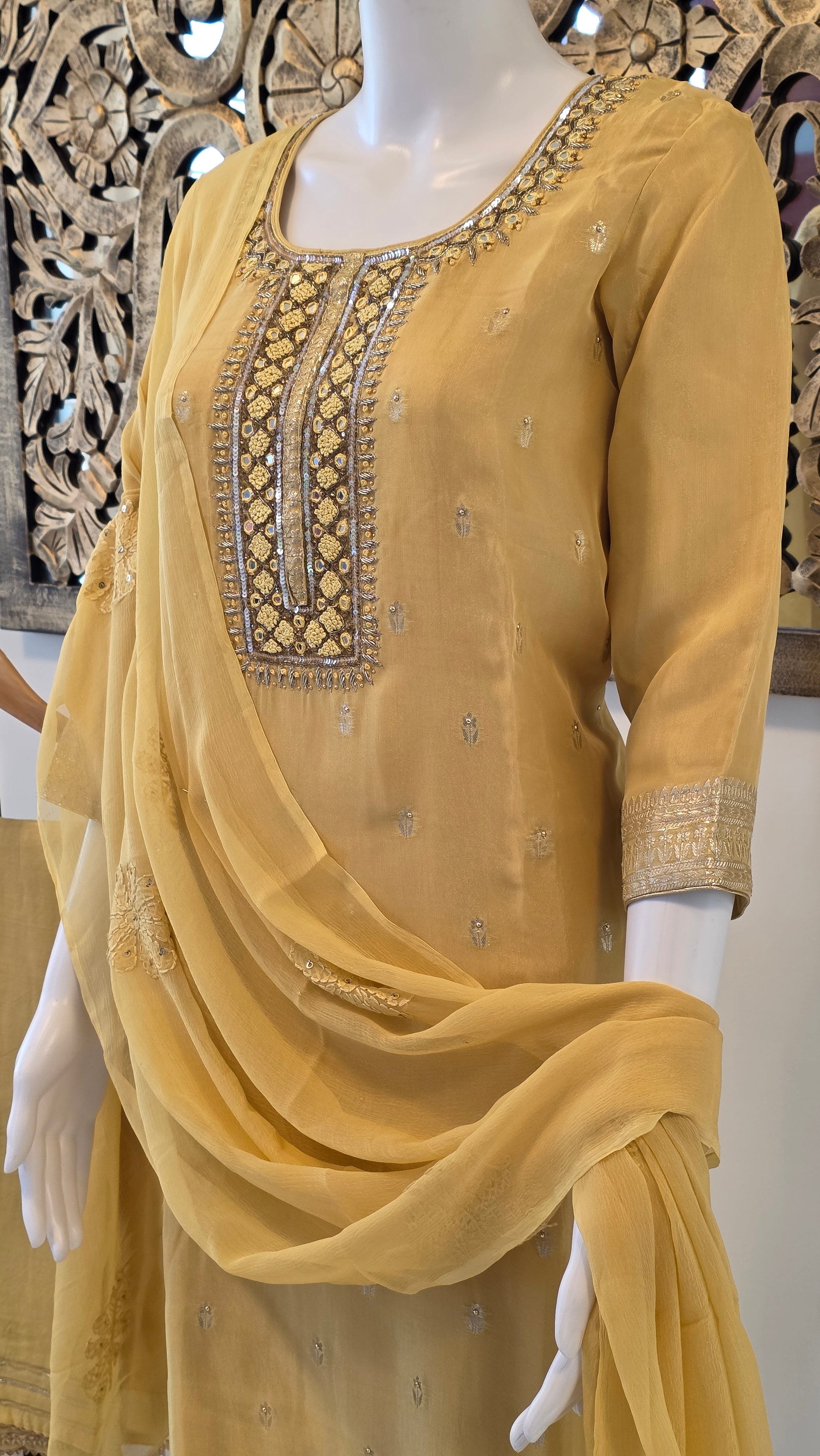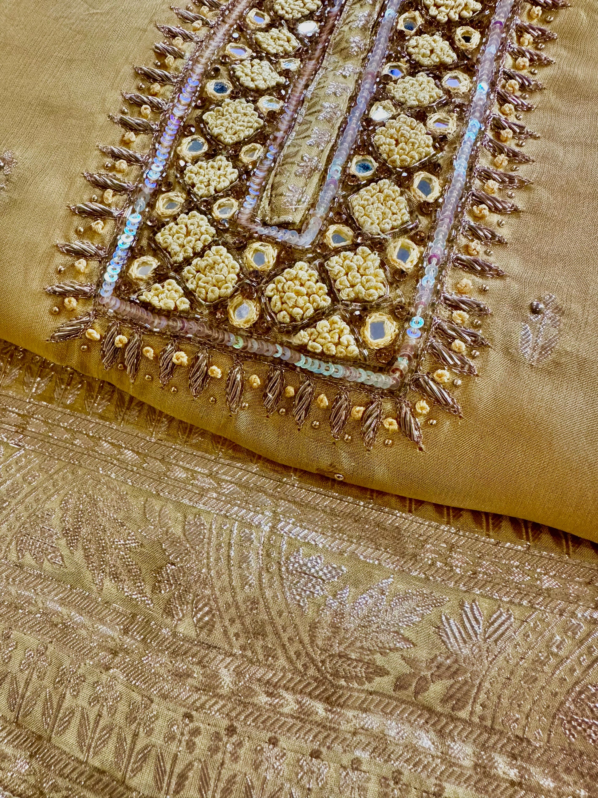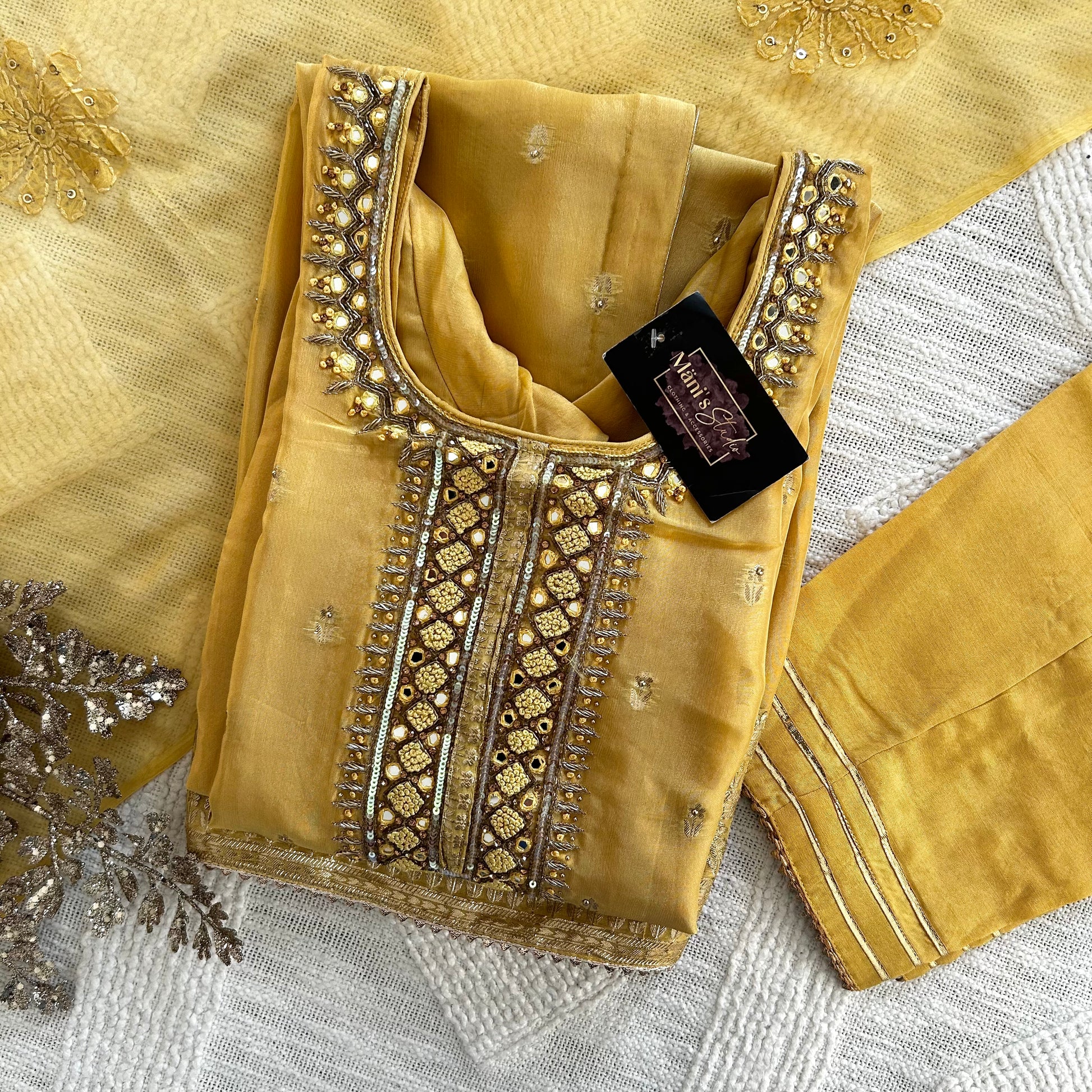 – Mustard silk-blend fabric with mirror-style and Zari embroidery