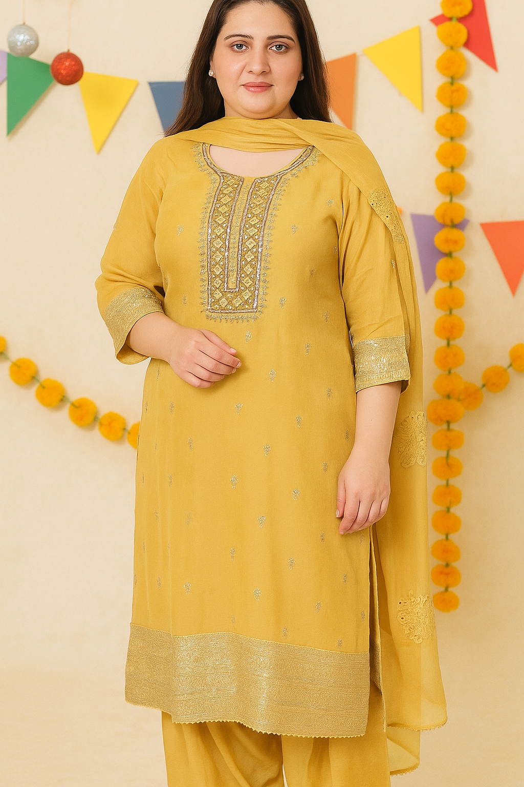 Soraya glows with golden charm and timeless elegance. This mustard yellow silk-blend suit is brought to life with ornate mirror-style and Zari embroidery along the neckline and front panel. The fabric’s natural sheen enhances its festive appeal, while the matching trousers feature subtle piping and detail. The net dupatta with scattered sequin work and shimmer borders adds a graceful layer to this radiant ensemble.