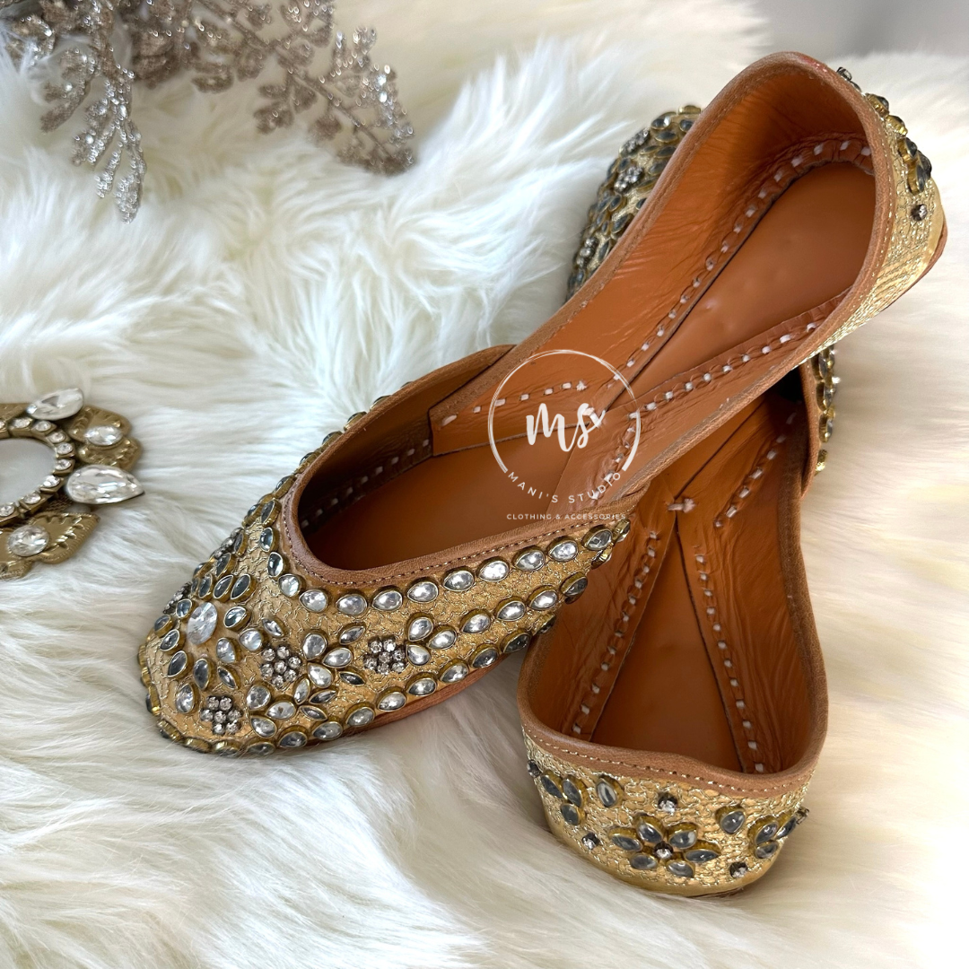 Regal and rich, this jutti is encrusted with statement kundan work in stunning emerald green. Crafted to steal the spotlight, Zara is ideal for wedding guests, haldi functions, or a glam desi look. Also Available in Gold.