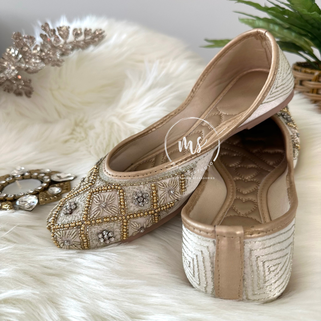 Soft gold meets delicate zari and mirror accents in this dreamy pair. Zari Sitara is lightweight yet festive — perfect for intimate gatherings, pujas, or styling down a heavy look with graceful balance.